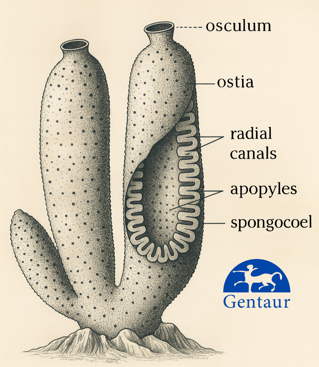 - Pathway: Ostia → Incurrent Canal → Prosopyle → Radial Canal → Apopyle → Spongocoel → Osculum